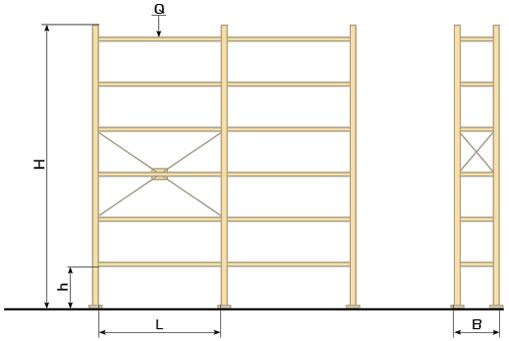 L – длина полки, B - ширина полки, H – высота стойки, h – высота полки, Q – нагрузка на ярус.